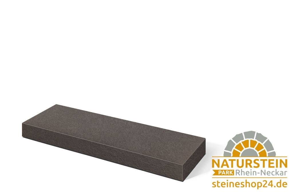 Abdeckplatten Anfangs-/Endstück, Oberfläche und zwei Längskanten und eine Kopfseite in Emperor Keramik, 5x28x119,5 cm, auf Gehrung gesägt und frostfest verklebt, ein Kopf gesägt mit sichtbaren Betonkern. Beide Seiten und ein Kopf mit Wassernase. Gehrungskanten mit Fase, Feinsteinzeug mit Betonkern
