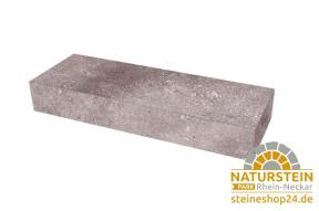 Blockstufen aus 3 cm Emperor Keramik, Oberfläche R11, Trittfläche und eine Längskante (Stellfläche) in Emperor Keramik, auf Gehrung gesägt und frostfest verklebt, Rückseite, Unterseite und beide Köpfe offen mit sichtbaren Betonkern. Gehrungskanten mit Fase, Feinsteinzeug mit Betonkern.
